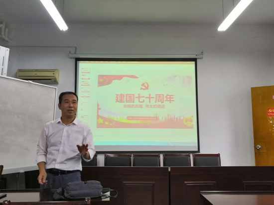 党委书记以“建国七十周年——光辉的历程伟大的奇迹”为题,结合“不忘初心、牢记使命”主题教育学习调研和学院实际,为全体学生党员讲授了一堂生动的主题党课。