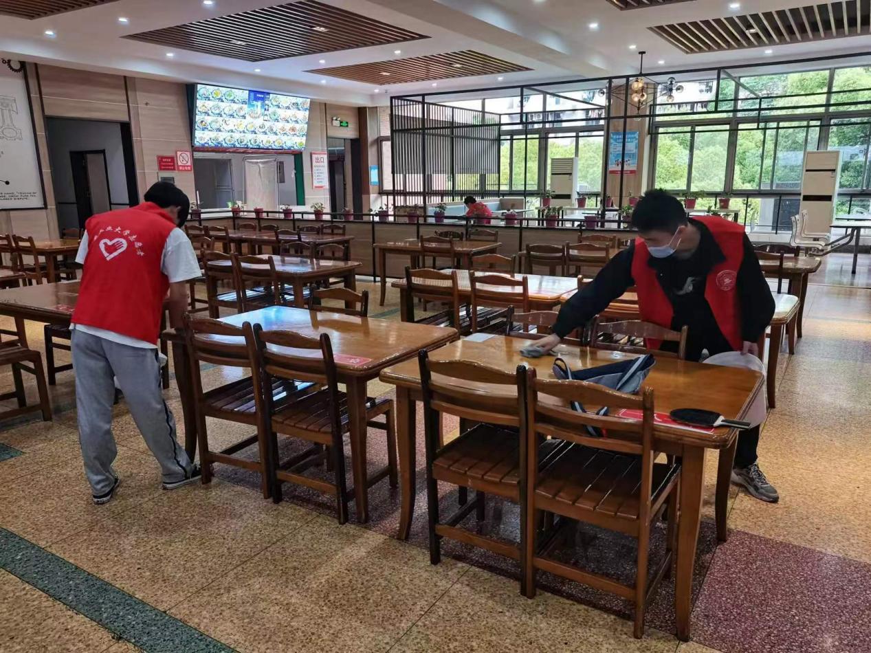劳动实践中,同学们在食堂工作人员的指导下,分组进行志愿服务,有的同学担任食堂志愿者,通过打扫卫生、整理桌椅亲身感受服务性劳动的不易与艰辛;有的同学走进餐盘回收处,提醒同学们不要浪费粮食,号召“光盘行动”。在用餐高峰时间,督导队的志愿者们不辞劳苦,秉承着勤劳肯干、认真负责的工作态度,用心对待执勤任务。他们在每一个楼层维持就餐顺序,提醒就餐学生文明用餐,共同维护食堂就餐秩序和环境卫生。