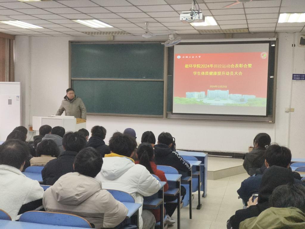 为表彰在田径运动会中表现优异的运动员,动员全院学生积极参与体育锻炼,共同提升体质健康水平,能环学院于12月23日在教三北119召开2024年田径运动会表彰会暨学生体质健康提升动员大会。院党委副书记、副院长卫军帅、各班级班长、团支书、体育委员、学习委员、运动员代表、全体辅导员出席会议,会议由院团委书记沈厚发主持。