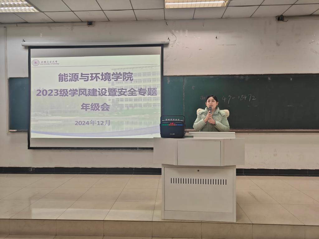 为总结学风建设现状,提高诚信考试意识,引导学生树立安全意识,12月27日上午,能环学院于教三南103召开了期末学风建设暨安全教育专题年级会。会议由2023级辅导员费丽主持,副院长卫军帅、辅导员吴飞、周虹晶和全体学生参会。