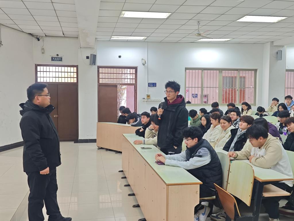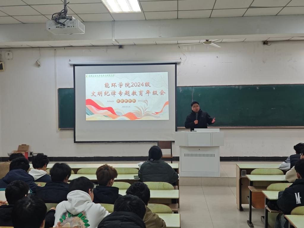 在教三南103教室召开了2024级学生文明纪律专题教育年级会,2024级全体学生参加会议,会议由辅导员范浩东主持,学院党委副书记、副院长卫军帅主讲。