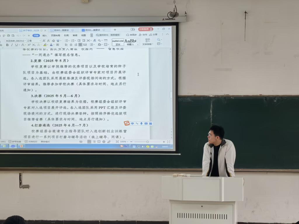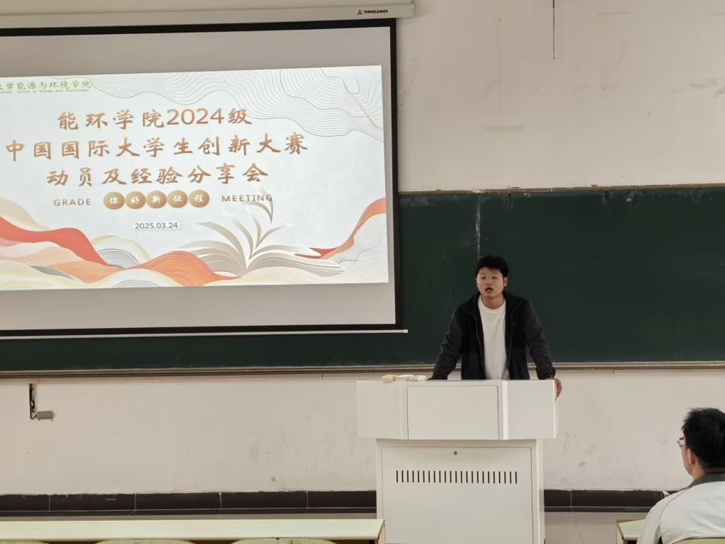 在教三南203教室召开2024级中国国际大学生创新大赛动员暨经验分享会。会议由院团委副书记范浩东主持,学院2024级全体学生参会。会议特邀2022级优秀学子李涛担任主讲,为新生解读赛事规则并分享实战经验。